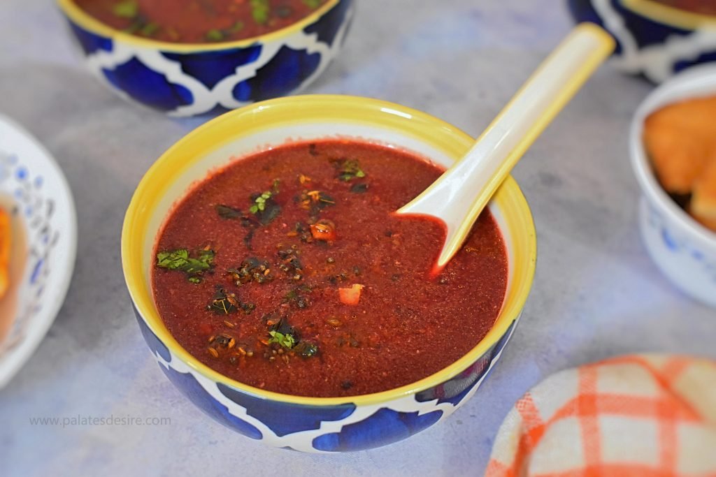 This hot bowl of beetroot soup is perfect for any rainy / winter days. Serve it along with some garlicky croutons for a light dinner.