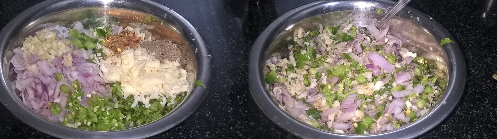 In a bowl and mix all the chopped ingredients,grated cheese and add seasoning,pepper and salt as required.Be careful while adding salt if you are using a salt bread and also cheese has lots of salt in it already.