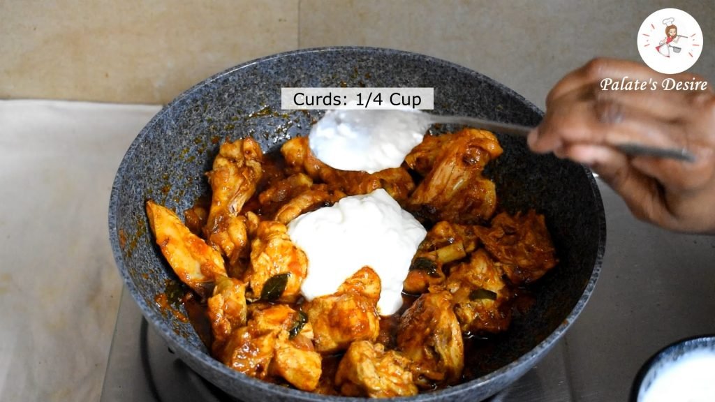 - Make sure to add curds once chicken is cooked.Keep flame high add curds and roast 4 times.