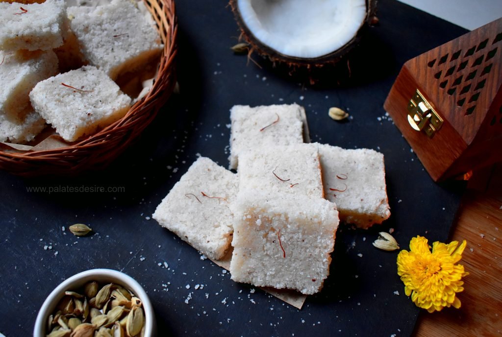 This coconut burfi is a traditional recipe of Karnataka , popularly known as kobbari mithai . Its a easy recipe made with minimal ingredients. Texture of this sweet shouldn't be soft nor hard , if done rightly .