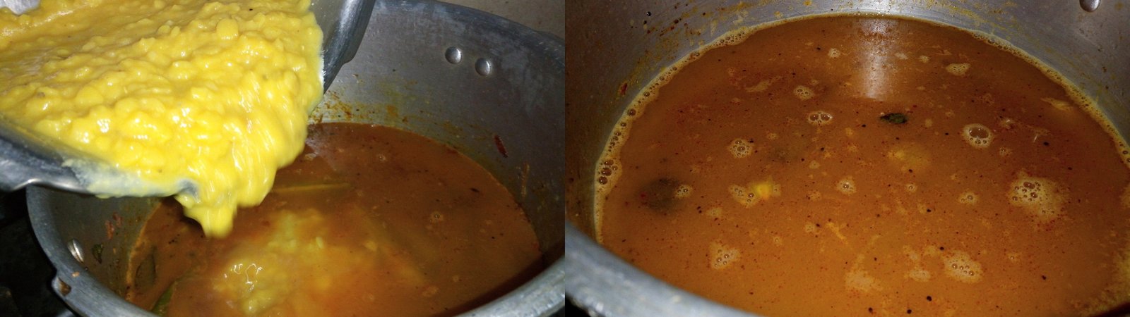 - Add salt and bring it to boil.Once it comes to boil , add in cooked dal ,1.5 cups of water and mix well.