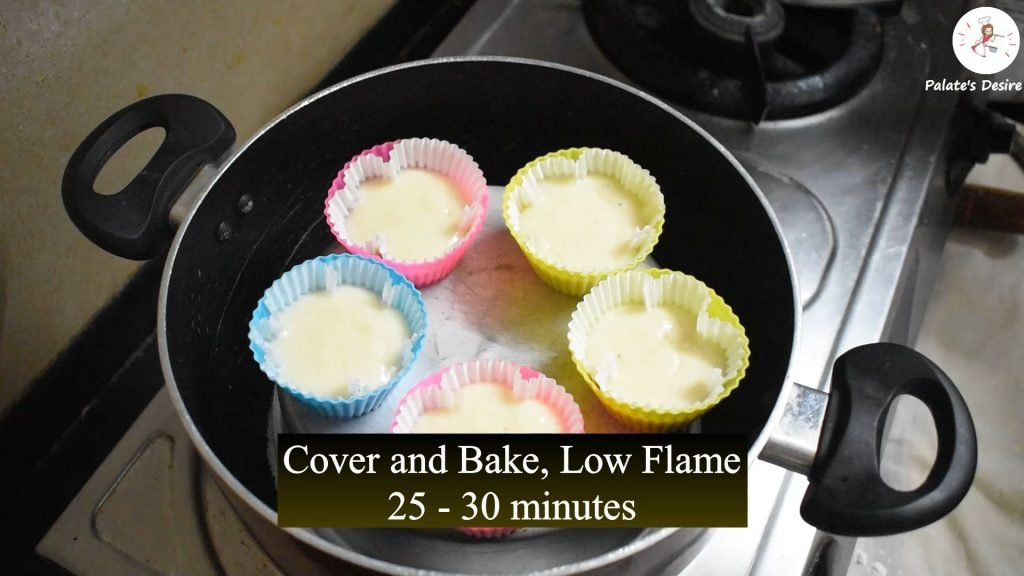 - Cover with the lid and bake on low flame for about 25-30 minutes. Insert a tooth pick at centre of the cake, if it comes out clean then cake is done. If baking in oven, bake for 18-20 minutes in 180 deg celsius or till toothpick inserted at centre comes out clean.