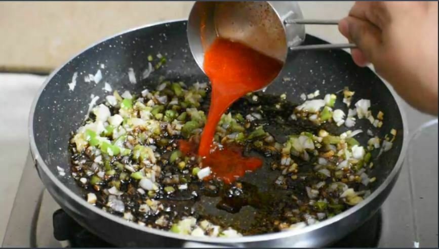 - Add tomato ketchup or hot and sweet tomato sauce and stir well everything.