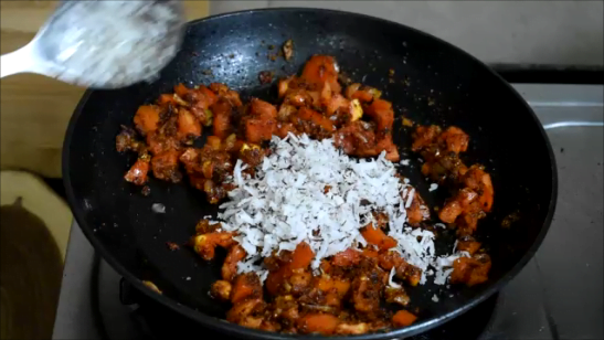 - Add grated dry coconut and fry along with onion , till it starts turning brown.