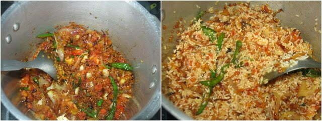 Now add in rice and saute for few minutes, add hot water, salt and pressure cook for a whistle.