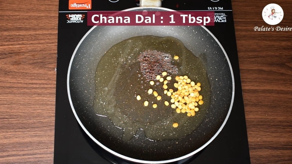 - In a pan , heat cooking oil. Add mustard seeds , when it splutters add chana dal., let chana dal slightly changes it colour to golden brown.