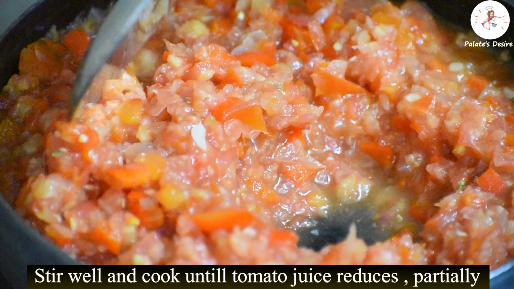 - Stir well and cook until tomato juices condenses partially.