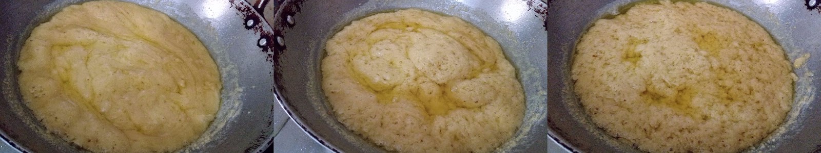 5. Keep Mixing so that Ghee is well incorporated within the besan. When it starts leaving the edges and looks like foam mass ,add 1-2 tablespoon of ghee mix well .