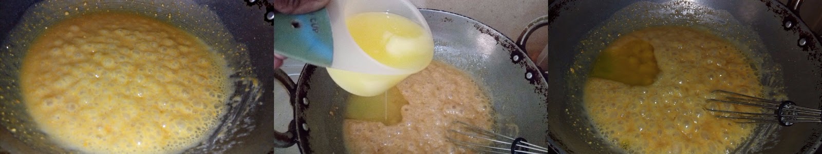 4.Take 1 cup Ghee and divide into 4 parts , add ghee part by part thoroughly and whisk , once ghee is absorbed add one more part of ghee and mix well,repeat the process till you complete all 4 parts of ghee.