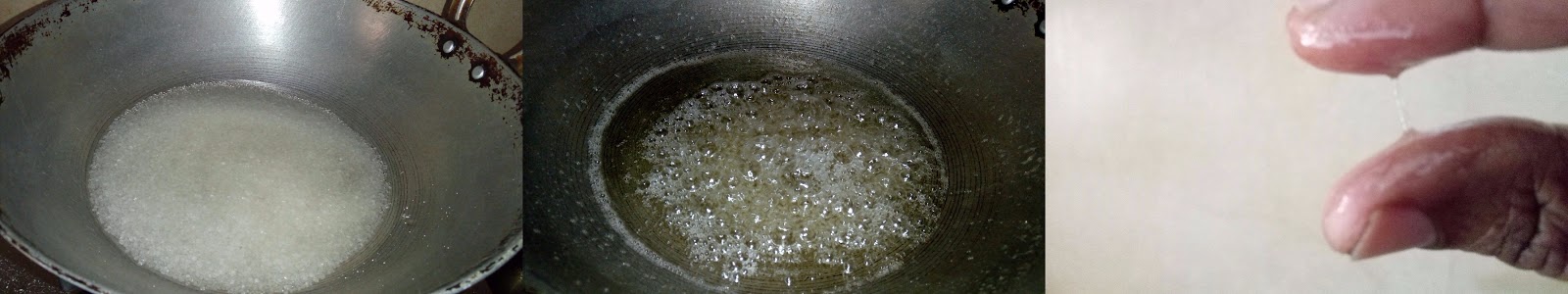 - Take sugar in a deep thick bottom kadai /pot ,add water just to immerse sugar. Keep on high heat,let sugar dissolve once it starts to boil ,reduce the flame to medium heat and boil till you get 1 string consistency.