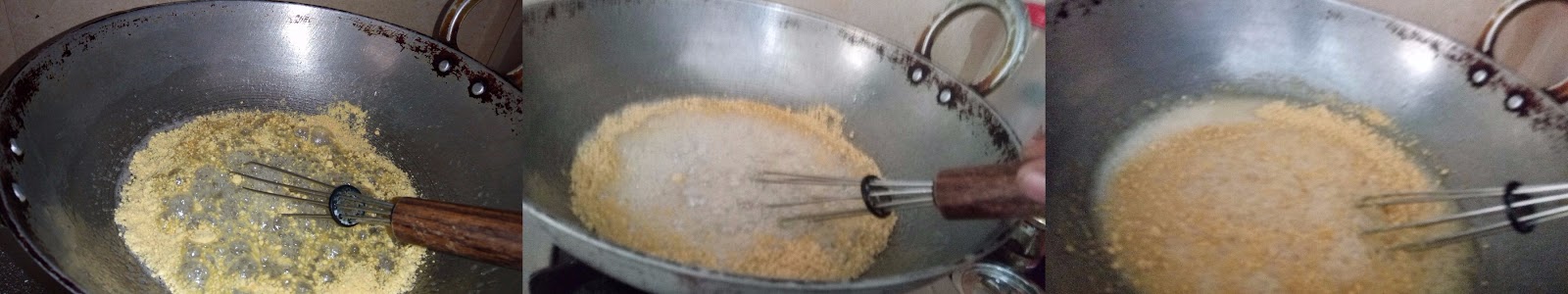 1. Sieve gram flour and roast it well,until you get nutty aroma.Gram flour colour turns light golden colour. Roast it on a medium to low heat ,take measures not to burn it.