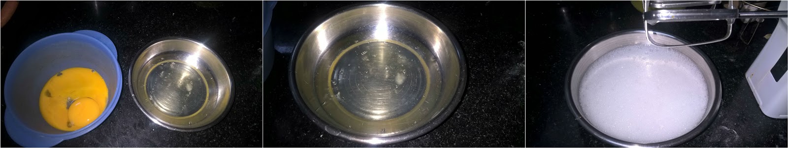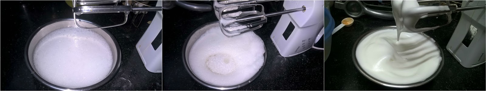 1. Seperate eggs, and take the egg whites in a medium sized bowl, beat with the hand mixer. When it starts foaming well, add the cream of tartar (or lemon juice),continue to beat gradually increasing the speed to medium high.