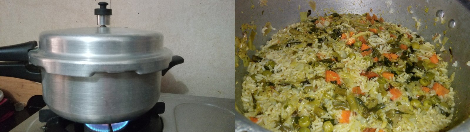 - As pressure cooker is used here for cooking rice , 3.5 cups of water is sufficient. As masala and vegetables also has water content.