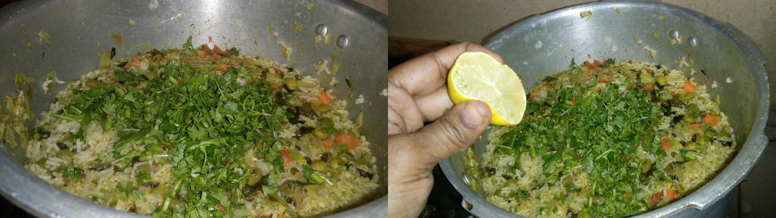 - Open the lid , add chopped coriander leaves , lemon juice and 1 tablespoon of ghee , mix well.