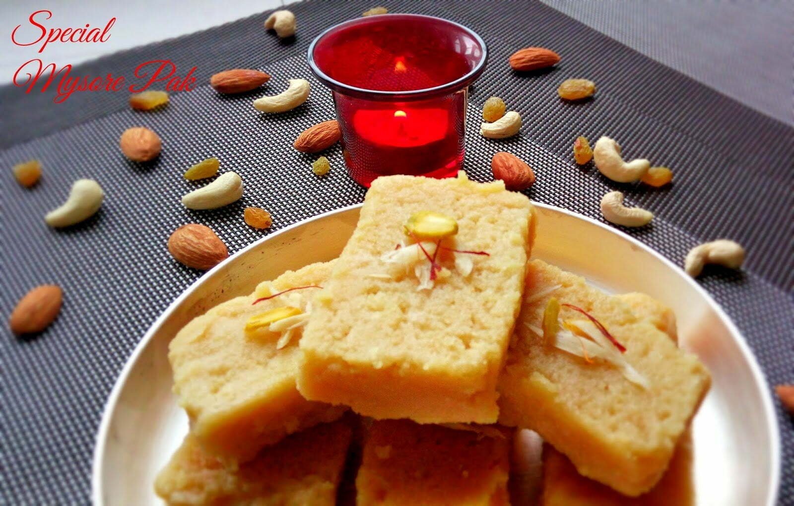 Special Mysore Pak is a simple and delicious traditional sweet from Mysore made from gram flour . ghee and sugar.