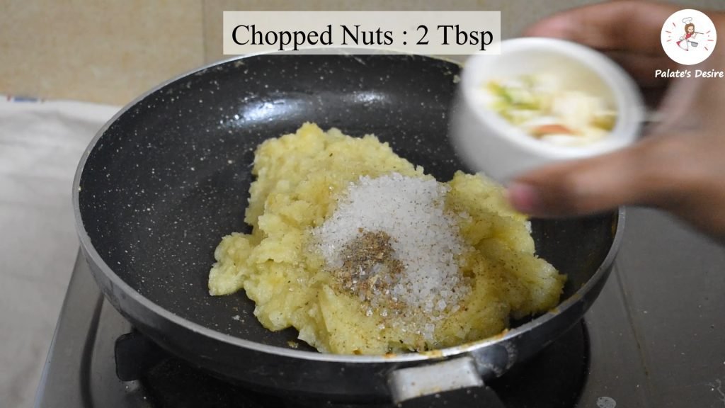 - Then add sugar, cardamom powder, pinch of nutmeg and chopped nuts.