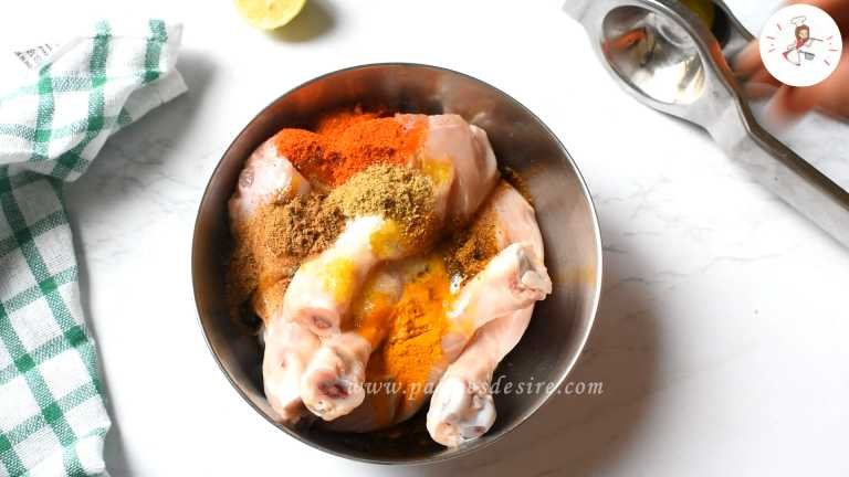 - Take chicken in a mixing bowl , add salt , red chilli powder , roasted cumin powder, garam masala , coriander powder, lime juice and mustard oil.
